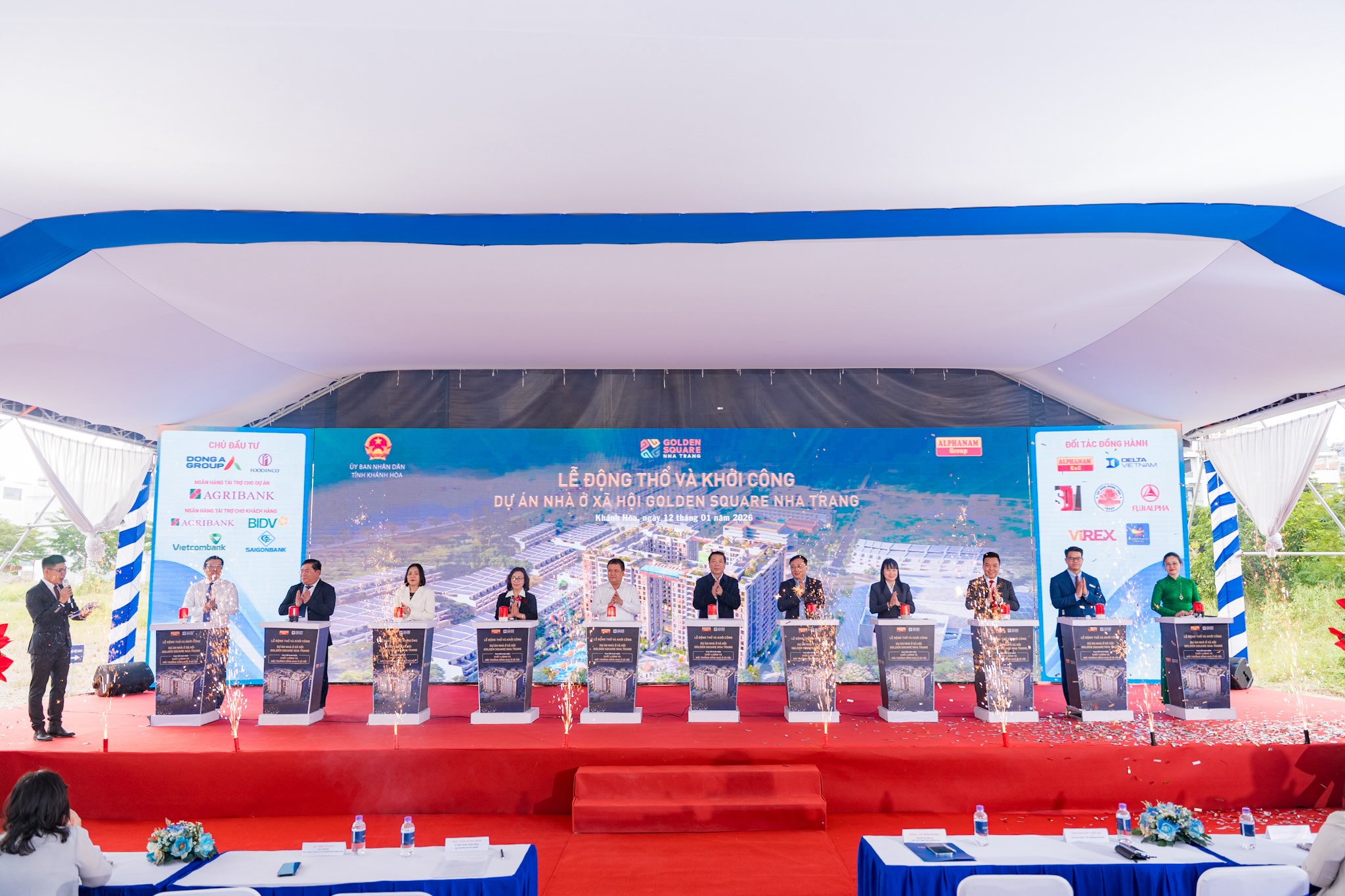 Lễ Động thổ và Khởi công Dự án Nhà ở xã hội (NOXH) Golden Square Nha Trang vinh dự đón tiếp các đồng chí Lãnh đạo Trung ương và địa phương, gồm: đồng chí Trần Hồng Minh – Ủy viên Trung ương Đảng, Bộ trưởng Bộ Xây dựng; đồng chí Trần Phong – Phó Bí thư Tỉnh ủy, Chủ tịch UBND tỉnh Khánh Hòa; đồng chí Lê Quyết Tiến – Cục trưởng Cục Kinh tế quản lý đầu tư xây dựng, đồng chí Hoàng Hải – Cục trưởng Cục Giám định chất lượng công trình xây dựng, đồng chí Bùi Quang Thái – Cục trưởng Cục Đường bộ Việt Nam, đồng chí Tống Thị Hạnh – Cục trưởng Cục Quản lý nhà và thị trường bất động sản, đồng chí Nguyễn Thành Phú – Giám đốc Sở Xây dựng tỉnh Khánh Hòa; đồng chí Trần Nam Bình – Bí thư phường Nam Nha Trang; cùng đoàn công tác của Bộ Xây dựng và đại diện Thường trực HĐND, UBND, Ủy ban MTTQ Việt Nam tỉnh Khánh Hòa; lãnh đạo các sở, ban, ngành, lực lượng vũ trang và cơ quan quản lý địa phương.